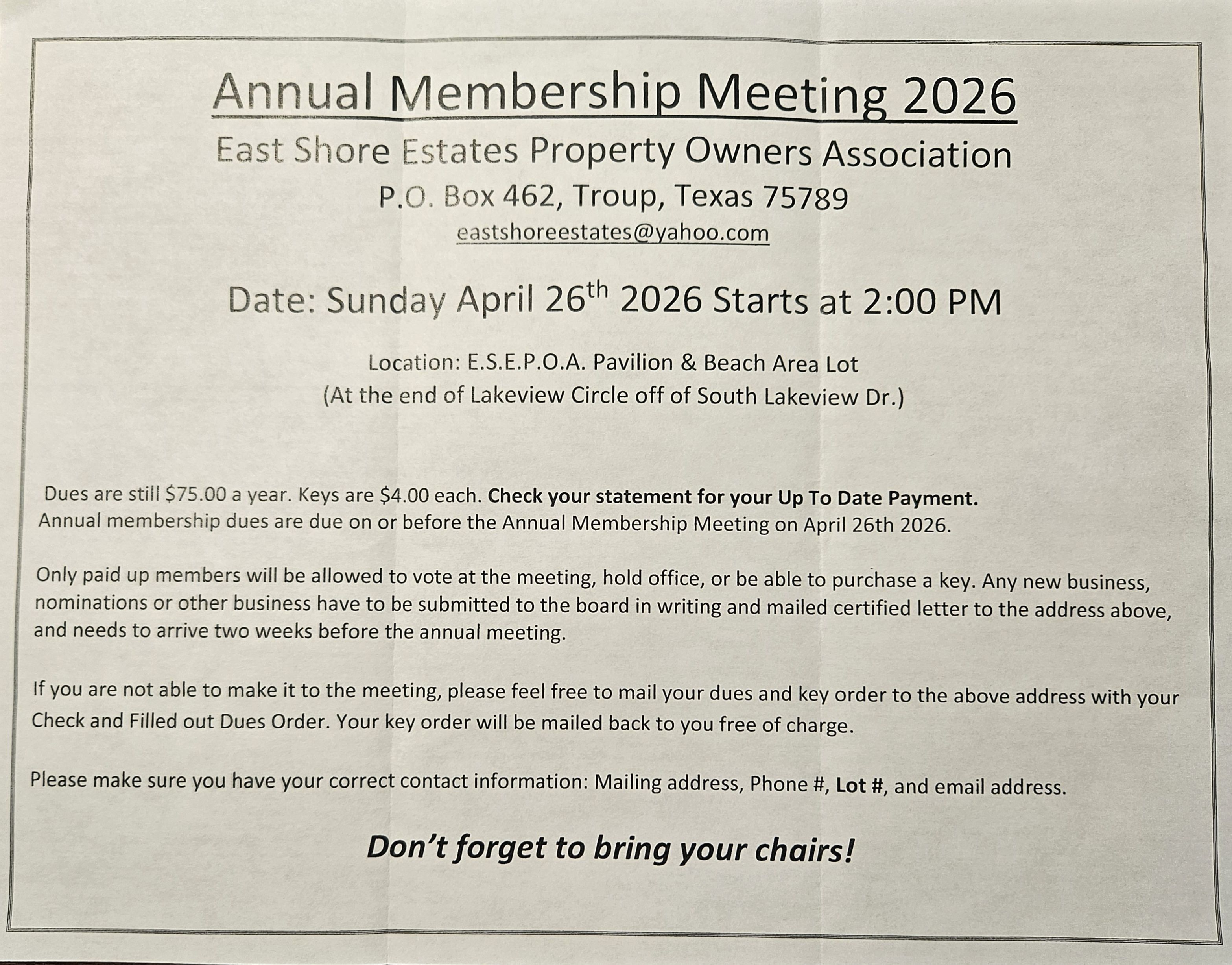 2026 East Shore Estates Annual Meeting Notice. Submitted by Bob Dillon -Webmaster.